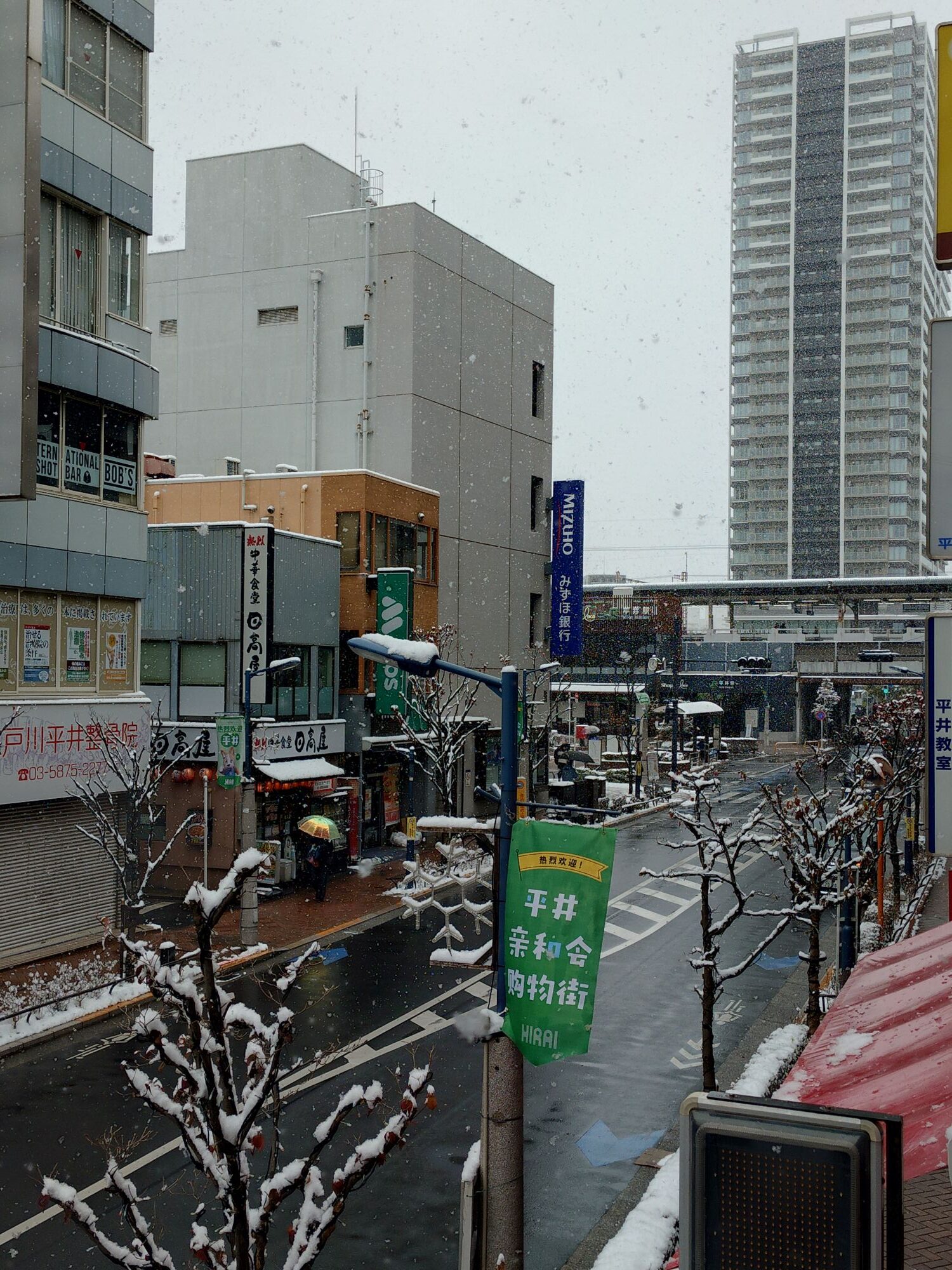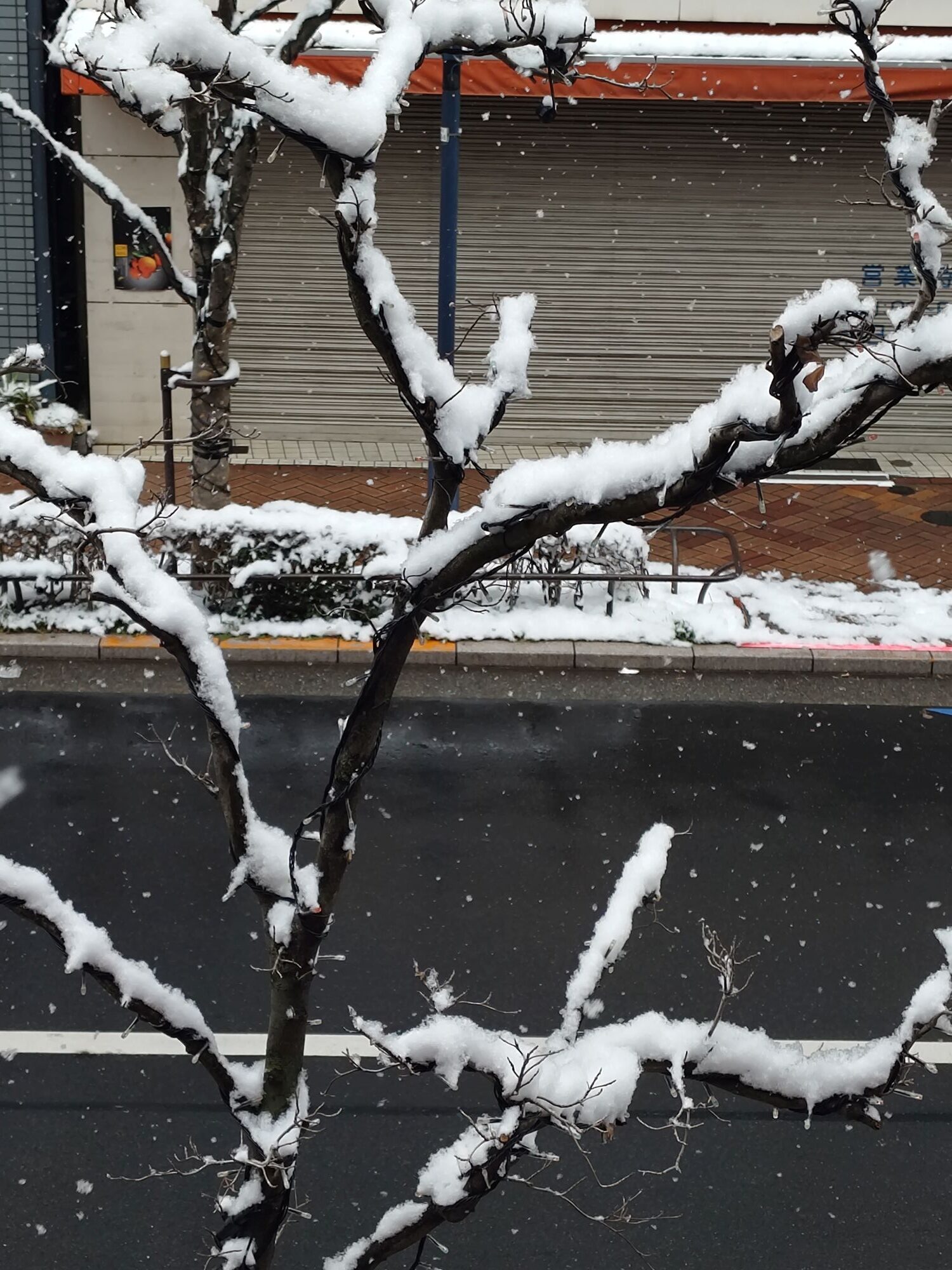 平井の街も久しぶりに雪が降りました。前日のお昼ごろから断続的に降り今日は街路樹や花壇にも積もりました。日中も気温が上がらず寒い一日でした